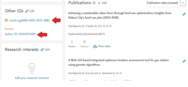 h-index dan Citation langsung muncul di bagian awal sebelah kanan identitas. Selain ID scopus tergeret, ternyata ada fasilitas untuk menghubungkan mendeley dengan ORCID. Hal ini penting karena tidak semua peneliti memiliki ID scopus sementara ID orcid dapat dengan mudah dibuat secara cuma-cuma.