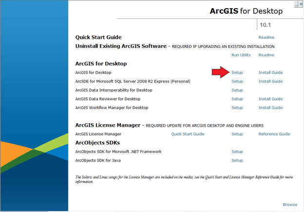 Banyak sekali aplikasi yang tersedia di ArcGIS. Namun demikian ArcGIS desktop wajib diinstall, tekan Setup untuk menginstallnya di menu ESRI setup. Selain itu tentu saja diperlukan juga ArcGIS license Manager atau ArcObjects SDKs.