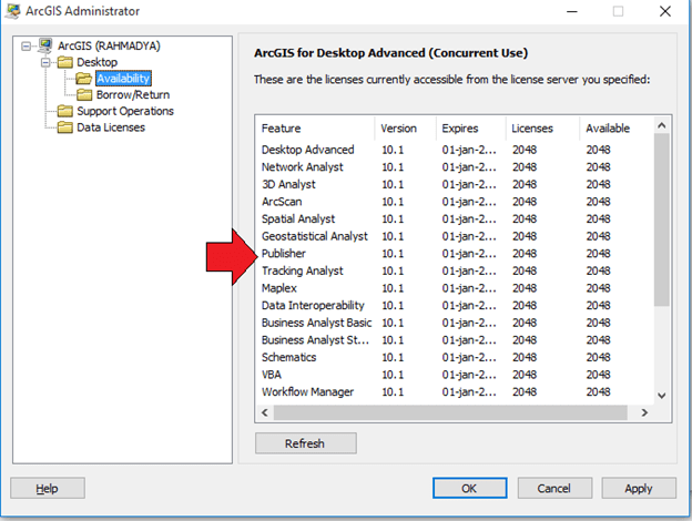 Gunakan perintah ipconfig/all di command window untuk mengetahui nama PC yang akan diinstall ArcGIS (bisa juga cara lain lewat menu seting, tetapi saya lebih cepat dengan command window). Gampangnya, langkah terakhir harus ada 3 yang diutak-atik: 1) ArcGIS administrator, 2) License Manager, dan 3) file service.txt. Terakhir lakukan “re-read” di license manager dan pastikan juga Availability sudah terisi fitur-fitur yang diperlukan.