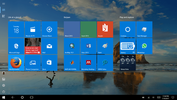 Dan yang terpenting adalah adanya pilihan tablet mode dan Desktop mode yang memberi kebabasan pengguna mengikuti Windows 8 atau Windows 7 formatnya. Silahkan masuk ke menu setting dan cari2 sendiri cara memilihnya. Hmm .. ternyata saya lebih menyukai Tablet mode yang menyerupai Windows 8. Sepertinya wakeup lebih cepat dari versi desktop (mungkin perasaan saya saja). Tetapi semua terserah pengguna, mana yang lebih familiar. Berikut ini tampilan versi tablet dari Windows 10 pro.