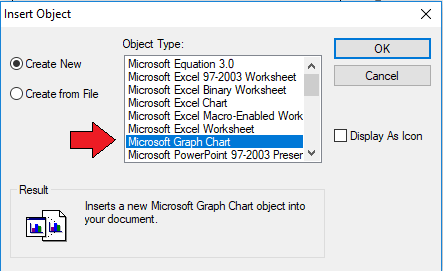 Insert Object dapat diakses lewat menu Insert – Object. Setelah itu tinggal pilih tipe object yang akan digunakan, di sini kita ambil contoh Microsoft Graph Chart.