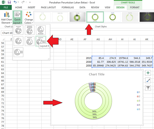 Kolom pertama menggambarkan tahun sementara kolom yang lainnya adalah luas (hectares) kelas lahan (berturut-turut pertanian, bare, builtup, tanaman dan air). Pada excel tekan insert – Chart dan pilih doughnut yang letaknya di bagian bawah. Agar lebih cepat pembuatan doughnut-nya sorot data selain tahun, karena yang akan ada di grafik adalah datanya saja. Tahun bisa kita tambahkan nanti untuk legend.