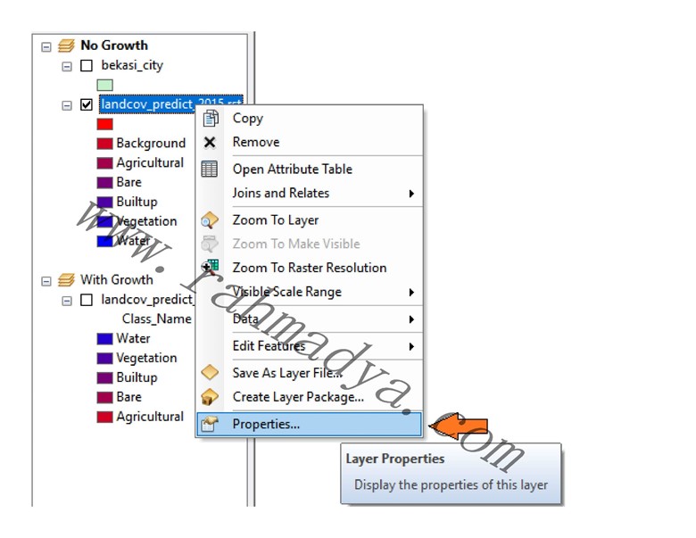 Atau dobel klik saja layernya, kemudian masuk ke tab ‘Simbology’ untuk menghilangkan ‘Background’ nya yang tidak ingin kita gambar di Layout ArcGIS (lihat post sebelumnya tentang layout) nantinya. Atur juga warna indikator di peta yang akan digunakan untuk ‘Legend’ nantinya.