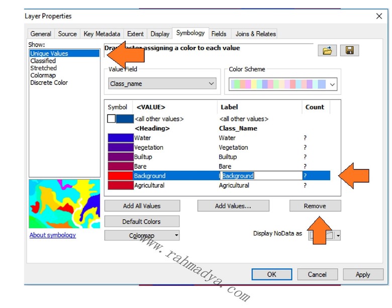 Salah satu hal yang membuat Idrisi sedikit ribet adalah adanya ‘background’ berwarna merah. Untungnya tanpa memanggil ArcToolbox ‘Spatial Analysis’ dapat dihilangkan, yaitu dengan Simbology yang ada di properties.