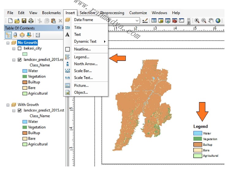 Masuk ke menu “layout view” untuk membuat peta. Tambahkan “legend” dan pendukung peta lainnya hingga dihasilkan peta yang siap dicetak/digunakan. Semoga bermanfaat.
