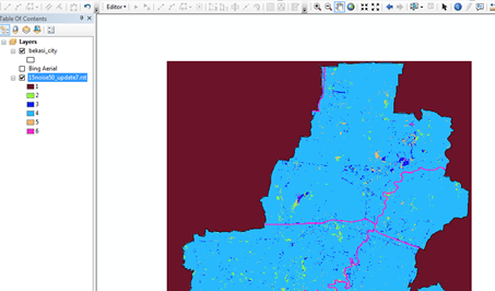 Salah satu tugas penting penelitian mengenai land use adalah klasifikasi citra satelit. Biasanya hasil pengolahan citra yang utama adalah unsupervised classification yang harus dicek lagi akurasinya dengan data real yang lebih akurat (ground view), misalnya aerial view, study lapangan dengan GPS, ataupun cara lain (Google earth, bing aerial, dll). Hasil klasifikasi perlu dipilah misalnya builtup saja, vegetasi saja, dan kelas-kelas lainnya. Dengan ArcGIS untuk memilahnya tidak terlalu sukar, hanya dengan simbologi sudah cukup untuk memisahkan satu kelas dengan kelas lainnya. Misalnya gambar di bawah ini adalah kelas-kelas hasil unsupervised classification pada IDRISI yang diekspor ke ArcGIS.