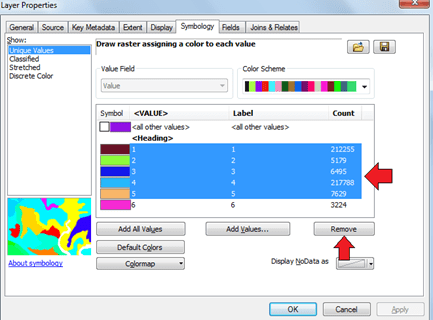 Dobel klik saja pada peta klasifikasi yang sudah di-geret dari file-nya lewat Catalog. Selanjutnya misalnya yang berwarna merah mudah adalah air, dan akan kita pisahkan dengan yang lain. Tinggalkan saja air dan yang lainnya remove dari symbology.