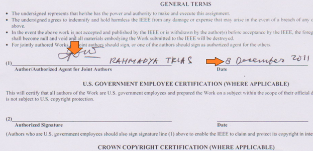 Sekarang masalahnya adalah mengisinya. Ada lima isian yang harus diisi yaitu: 1) judul paper, 2) Author, 3) Nama jurnal/conference, 4) Nama dan tanda tangan, 5) Tanggal penandatanganan. Biasanya, panitia seminar sudah mengisikan nama conference yang akan dilaksanakan.