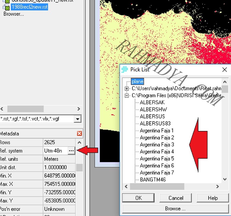 Gambar di atas adalah hasil klasifikasi (unsupervised) dengan IDRISI. Perhatikan di bagian metadata di bawah kiri. Pada isian ref system pilih proyeksi yang sesuai.