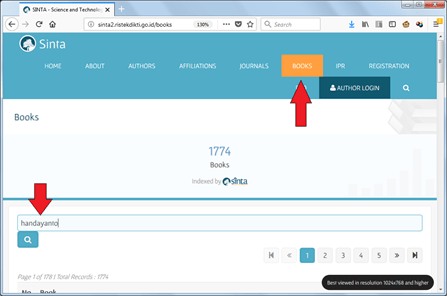 Klik menu BOOKS di SINTA dilanjutkan dengan mencari berdasarkan ISBN, judul buku, atau nama pengarang. Contoh di atas misalnya kita ingin mencari berdasarkan pengarang, tekan simbol kaca pembesar, dan jika ditemukan SINTA akan menampilkannya.