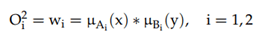 Jika pada lapis pertama hanya melibatkan tiap-tiap masukan, pada lapis kedua tiap masukan menuju lapis yang sama guna mengetahui kekuatan penyalaan (firing strength). Fuzzy Sets dikalikan antara satu masukan dengan masukan lainnya dengan hubungan sebagai berikut: