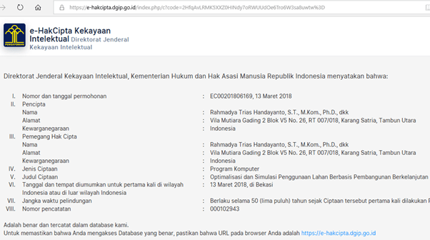 Perhatikan URL di bawah jika ditekan akan mengarah ke link HKI kita sesuai sertifikatnya. Link ini bebas diakses oleh siapapun (tidak perlu login ke DGIP).