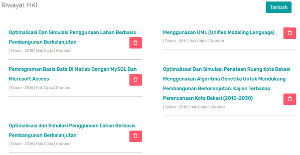 Selesaikan isian dari pengisian nomor pendaftaran, status (isi dengan granted), hingga upload pdf sertifikat HKI. Setelah itu tombol Simpan di kiri bawah ditekan. Perhatikan, nanti akan muncul daftar HKI kita di profil SIMLITABMAS. Sekian semoga bermanfaat.