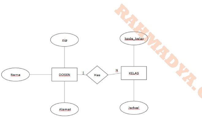 Dalam relasi suatu basis data dikenal beragam kardinalitas, antara lain: one-to-one, one-to-many dan many-to-many. Kardinalitas (cardinality) merupakan derajat jumlah suatu hubungan entitas. Entitas sendiri merupakan suatu abstraksi independen dari hal-hal yang terlibat dalam suatu sistem, misalnya dosen, mahasiswa, karyawan, dan lain-lain. Misalnya antara dosen dengan kelas, hubungannya biasanya one-to-many yaitu satu dosen mengajar satu atau lebih kelas dan satu kelas diampu oleh satu dosen (walaupun bisa saja lebih dari satu dosen). Jika dimodelkan konsepnya (conceptual model) akan berbentuk seperti ini (digambar online dengan ini: https://cloud.smartdraw.com/):