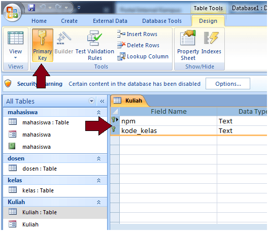 Kunci komposit adalah kunci yang merupakan gabungan dari beberapa field. Misalnya mahasiswa yang mengambil beberapa kelas mata kuliah dan kelas mata kuliah yang memiliki beberapa mahasiswa. Hal itu akibat dari hubungan/relasi Many-to-Many yang mengharuskan dibentuk satu tabel baru (Lihat Post sebelumnya). Untuk membuat kunci komposit pada Ms Access, gunakan SHIFT ketika menyorot field-field yang akan dijadikan primary key. Setelah itu tekan simbol key.