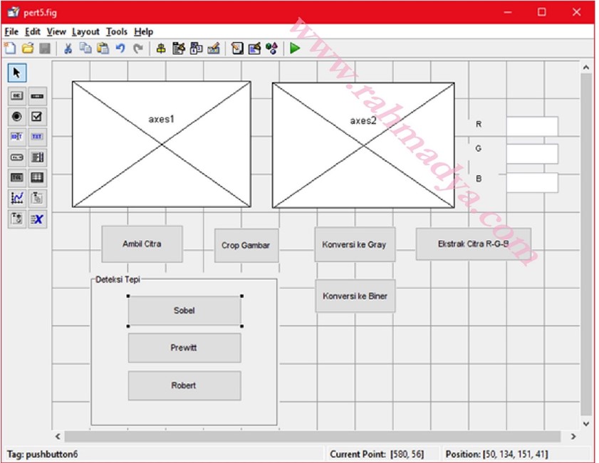 Di antara deteksi lainnya, seperti titik dan garis, deteksi tepi sangat bermanfaat untuk mengetahui suatu objek secara pasti dan terpisah dari objek lainnya, misalnya background. Pertemuan kali ini sedikit membahas metode-metode deteksi tepi yang terkenal antara lain: sobel, prewitt, dan robert. Untuk itu lanjutkan proyek sederhana pertemuan yang lalu dengan menambahkan satu panel berisi tiga pushbutton: sobel, prewitt, dan robert.