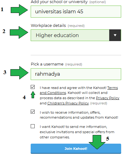 Hanya butuh tiga isian dan satu checklist konfirmasi sebelum lanjut (joint Kahoot). Checklist terakhir ditekan jika ingin menerima informasi baru dari Kahoot.