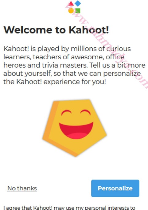 Selesai sudah daftar Kahoot. Pilih saja Personalize dengan beberapa isian baru agar sesuai dengan tema quiz. Atau jika tidak ingin, bisa pilih No Thanks.
