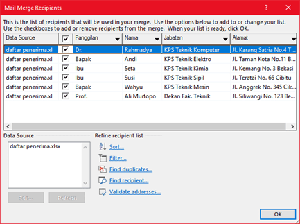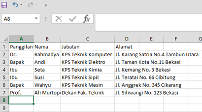 Daftar penerima dapat dibuat dengan aplikasi Microsoft Excel. Buat daftar enam penerima tersebut berisi kolom panggilan, nama, jabatan, dan alamat. Di sini panggilan untuk membedakan bapak/ibu atau Dr/Prof.