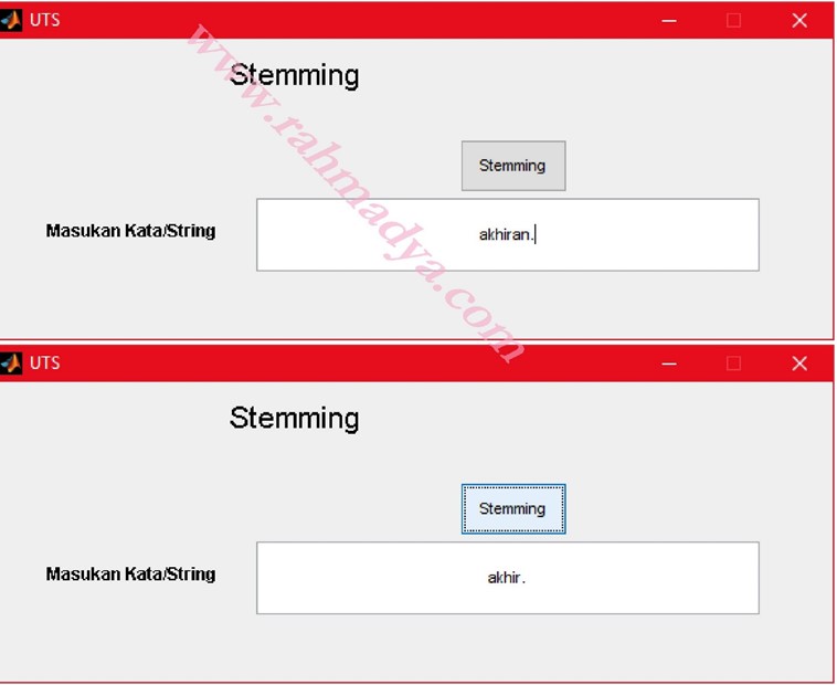 Jika pada pertemuan sebelumnya telah berhasil memisahkan kata-kata dalam suatu kalimat agar bisa menghitung jumlah katanya maka pada pertemuan kali ini akan mencoba memisahkan kata dari imbuhan (awalan dan akhiran) agar diperoleh kata dasarnya yang dikenal dengan istilah stemming/lematization. Proses ini sangat penting dalam perancangan mesin pencari (searching). Imbuhan merupakan ciri khas bahasa Indonesia yang memang berbeda sekali dengan bahasa Inggris. Coba rancang GUI berikut untuk melakukan proses stemming.