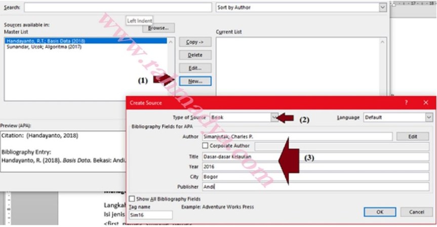 Tekan New jika ingin menambahkan satu sumber (1). Pastikan tipe sumber sesuai (2), jika tidak pilih yang sesuai. Isi data-data tulisan secara lengkap (3). Tekan OK jika sudah selesai. Berikut cara menyisipkan sitasi di tulisan.