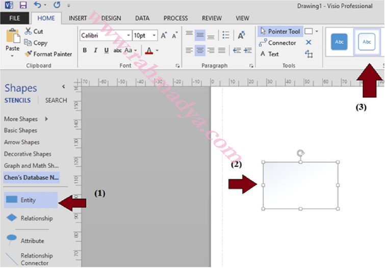 Ada empat bentuk dasar yang tersedia antara lain: Entitas, Relationship, Attribute, dan konektor relationship. Misalkan kita ingin menambahkan dalam model sebuah entitas, katakanlah barang. Drug mouse dari Entity ke bidang kerja. Hasilnya adalah segiempat dengan warna biru. Untuk merubahnya tekan format yang transparan (3).