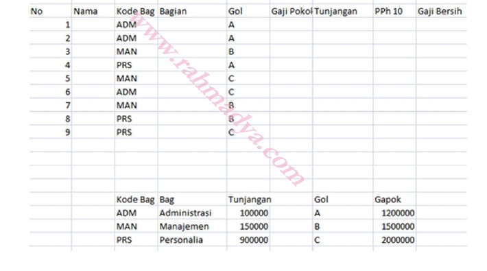 VLOOKUP merupakan satu fungsi yang mirip dengan sistem basis data. Satu buah kunci (key) akan mengarahkan ke field (atribut) yang lain. Misalnya gambar di bawah jika suatu cell diisi dengan kode ADM maka kolom bagian akan mengisi dengan “administrasi”. Begitu juga dengan MAN dan PRS. Begitu pula untuk golongan A, B, dan C yang akan mengisi gaji pokok berdasarkan golongan tersebut.