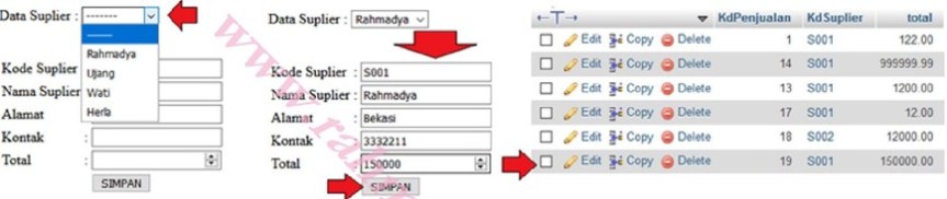 Sebagai contoh adalah tabel pembelian yang melibatkan tabel pembelian dan tabel pemasok (suplier). Karena pelanggan harus sesuai dengan tabel. Kode suplier pada tabel pemasok merupakan kunci tamu (Foreign Key) di tabel pembelian. Struktur file pembelian.php adalah sebagai berikut: