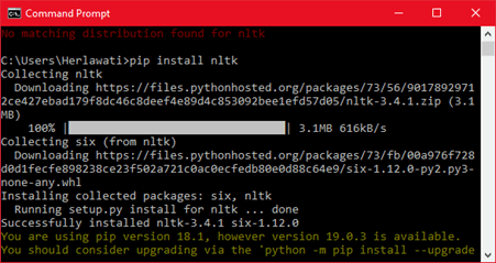 Tunggu beberapa saat hingga muncul pesan “Successfully installed nltk-3.4.1 six-1.12.0. Tetapi ada pesan lain pip versi 18.1 sebaiknya diupgrade menjadi versi 19.0.3.