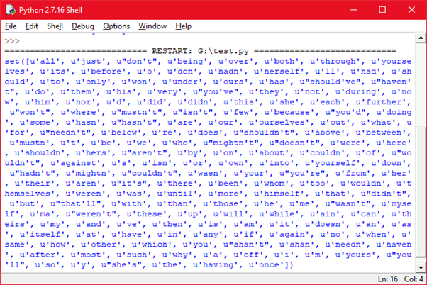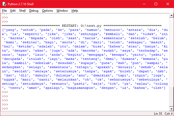Jika Natural Language Toolkit (NLTK) sudah diinstal, di dalamnya terdapat pula corpus yang berisi sampel data maupun kamus khusus, salah satunya adalah stopwords. Jalankan kode berikut ini dengan Python. Buka IDLE dan masukan instuksi berikut, simpan dan RUN.