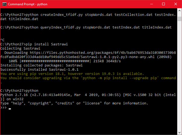 Corpus sastrawi dapat dilihat pada link resminya berikut ini. Jalankan pip install Sastrawi pada command prompt. Tunggu beberapa saat karena mengunduh file-file pendukung yang cukup besar.