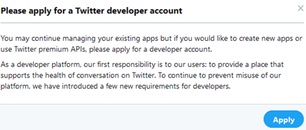 Selesai sudah mendaftar sebagai developer yang menggunakan fasilitas Twitter. Pastikan akan masuk ke jendela developer https://developer.twitter.com/en/account/get-started.