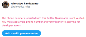 Setelah memasukan nomor ponsel yang sesuai, tunggu sms dari twitter untuk memasukan nomor verifikasi. Setelah meinginput nomor tersebut, maka phone number kita sudah terverifikasi. Tekan Continue. Berikutnya pilih perorangan atau organisasi app yang akan digunakan. Ada pertanyaan yang agak sulit mengenai mengapa membutuhkan API? Serta untuk apa dan metode apa yang digunakan nanti. Nah di sini kita diminta menjawab dengan gaya “mengarang bebas” karena diminta menulis jawaban lebih dari 300 kata. Akhiri dengan menekan Accept setelah membaca (kalau sempat) Term of Service.