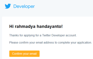 Jangan lupa menceklis kotak di bagian bawan TOS. Selanjutnya diminta membuka email dari akun kita. Jika sudah ada pesan masuk dari Twitter, tekan konfirmasi.