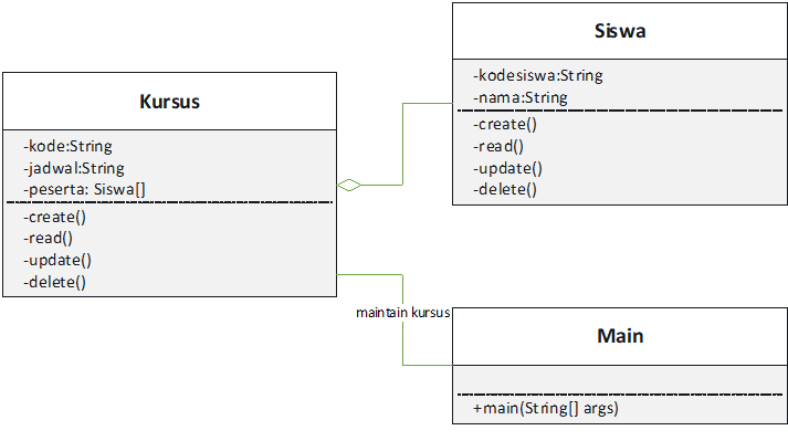 Pada kelas kursus terdapat atribut “peserta” yang berasal dari kelas Siswa. Karena menggunakan atribut maka terdapat relasi memiliki dari kelas Kursus terhadap kelas Siswa, diistilahkan dengan relasi “has-a”. Bandingkan dengan relasi antara kelas Main dengan Kursus yang berupa penggunaan saja (mengatur/maintain kursus), diistilahkan dengan relasi “is-a”. Berikut potongan kode dalam bahasa Java untuk kelas yang menggunakan objek dari kelas Siswa (peserta).