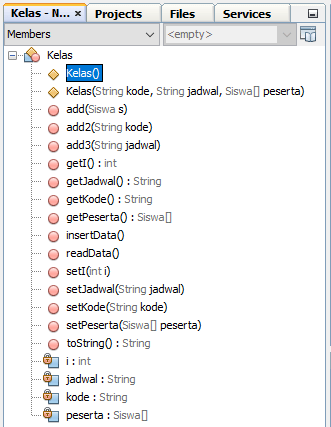 Peserta kursus memanfaatkan variabel I untuk menambah beberapa kali (dalam hal ini max 5). Operasi lainnya juga disertakan untuk menambahkan kode kelas dan jadwalnya. Jika dilihat di navigation pada Netbeans tampak seperti berikut ini.