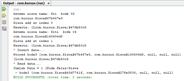 Ada satu Kelas dengan dua peserta ditambahkan dengan kode di atas, pastikan ketika dieksekusi akan menghasilkan jawaban yang mengindikasikan data tersimpan.