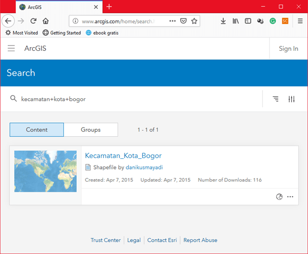 ArcGIS tidak hanya desktop melainkan juga online. Buka browser dan ketik www.arcgis.com. Tentu saja harus memiliki akun untuk login. Tetapi jika hanya ingin mengunduh tidak perlu login. Postingan ini mencoba mengunduh batas kecamatan wilayah kota Bogor.