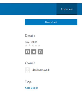 Jika sudah masuk ke situs arcgis cari simbol kaca pembesar yang artinya searching. Ketik kata kuncinya, misalnya “kecamatan kota bogor”. Berikut tampilan ketika data tersebut ditemukan.