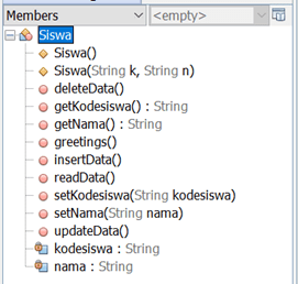 Pada Netbeans, kelas Siswa dapat dilihat di jendela navigator. Tampak atribut di bawah dan lingkaran yang menyatakan metode. Belah ketupat menyatakan metode yang masuk kategori konstruktor, yang berfungsi membuat satu objek baru.
