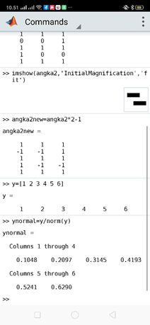 Selamat, Anda telah berhasil menginstal Matlab mobile. Berikut ini saya coba memanipulasi matriks, menampilkan citra dan menjalankan salah satu fungsi, yaitu normalisasi Euclidean. Beberapa juga sudah saya coba membuat plot/grafik, dapat dilaksanakan juga. Selamat mencoba, semoga bermanfaat.
