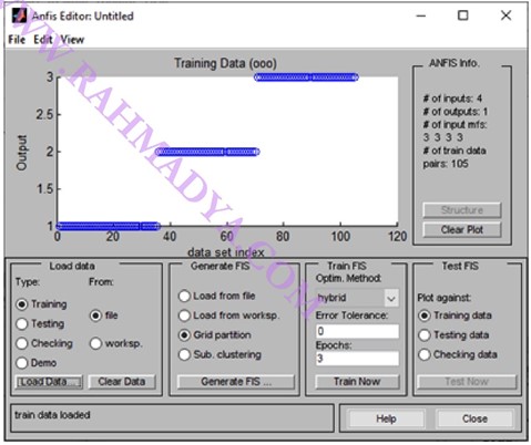 Pastikan training data muncul dengan tiga kelas sesuai dengan data (kelas 1, 2 dan 3). Berikutnya “Generate FIS” diklik untuk meramu FIS yang masih kosong.