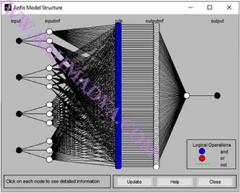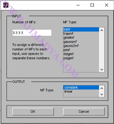 Angka 3 di atas berarti ada 3 komponen MF di tiap input. Jumlah angka yang muncul menandakan jumlah masukan, di sini ada empat input yang merupakan variabel penentu output. Tipe MF ada banyak, di sini akan digunakan “trimf” yang paling sederhana (linear). Gunakan saja defaultnya (3 komponen di tiap inputan), yang merepresentasikan kondisi “low”, “medium”, dan “high”. Output gunakan saja konstan. ANFIS hanya tersedia di jenis fuzzy “Sugeno”. Tekan “Struktur” di sisi kanan untuk melihat sekilas Network yang siap dilatih.