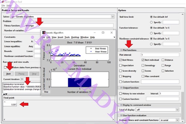 Perhatikan di bagian hasil, diperoleh titik 0.001 sebagai titik optimal dengan fitness 7.8. Sekian, semoga bisa menginspirasi.