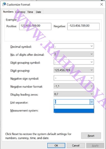 Hal tersebut diakibatkan karena ketika Excel menyimpan format tersebut, standar yang digunakan adalah titik koma ” ; ” bukan koma ” , “. Untuk membenahi hal tersebut masuk terlebih dahulu ke Control panel, dan pilih “Change, date, time and number format”. Ganti “List Separator” dari titik koma menjadi koma.