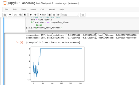 SA use some exponential calculation, so we need to import “math” library in the beginning. Open your Jupyter Notebook with the proper environment. Use Anaconda Navigator to get the environment and open the terminal. After finding your working direktory, type “Jupyter Notebook” to open the IDE in your browser automatically. Copy and paste the SA code at the end of this post to show how the SA work. You can change the objective function according your case study.