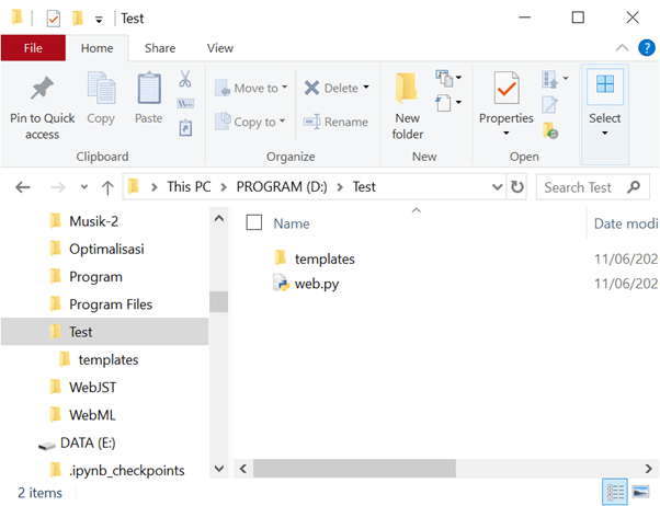 Flask membutuhkan satu file python untuk menghidupkan server dan beberapa templet HTML untuk input dan outputnya. Misalnya untuk contoh kita menggunakan satu file python “web.py” untuk menghidupkan server dan mengatur komunikasi templet lainnya: “mainpage.html” dan “result.html”.