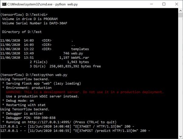 Dengan environment yang sesuai, masuk ke mode konsol dan ketik: python <namafile.py> di folder yang tepat. Pastikan server hidup dengan indikasi adanya instruksi untuk mengakses http://127.0.0.1:<port>.