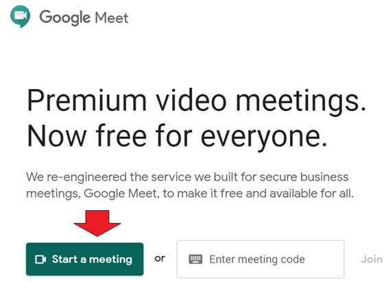Setelah itu kita tinggal membuat satu meet baru dengan menekan “Start a meeting”. Perhatikan kalimat di atasnya: “premium meeting is free for everyone”, yang artinya dulu hanya bisa gmail versi tertentu ac.id atau yang berbayar, sekarang oleh siapapun bisa, asal gmail.