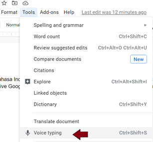 Untuk memulai mengetik, masuk ke menu Tools (atau alat jika sudah dalam bahasa Indonesia) lalu pilih Voice Typing (atau Dikte). Pastikan simbol microfon muncul di sebelah kiri google docs.